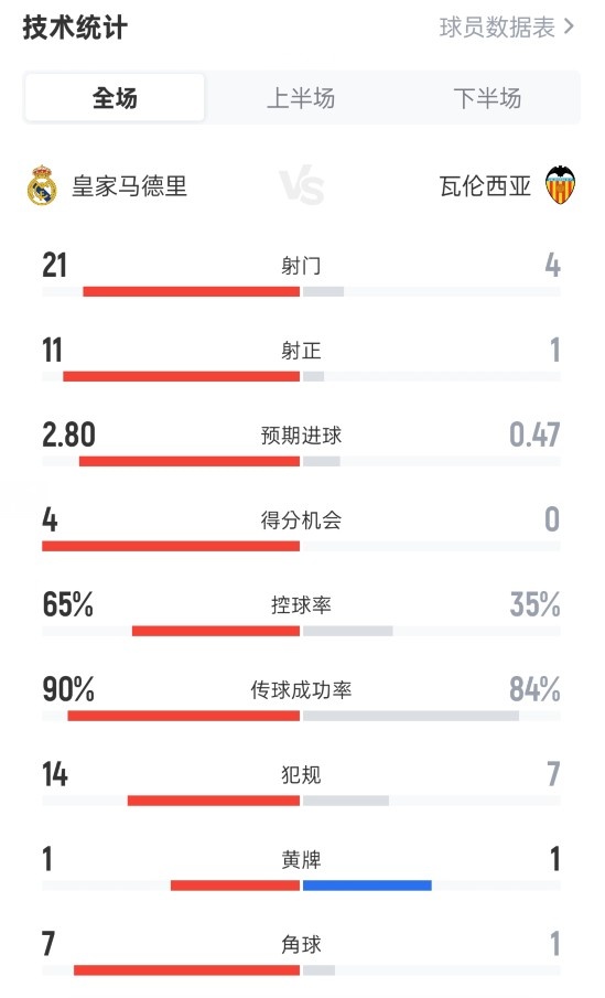 2025-11-02 08:04:08皇马4-0瓦伦全场数据:射门21-4,射正11-1,控球率65%-35%